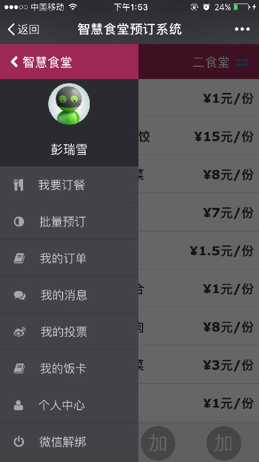 审核验证:首次进行订餐时,需要绑定用户,按提示进行绑定即可,绑定后即可正常使用平台订餐功能。)