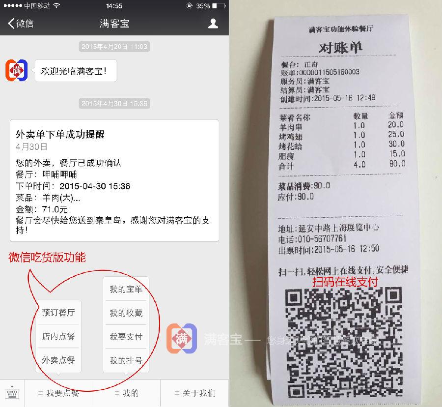 在为顾客提供的个性化服务方面,首先满客宝帮助顾客与餐厅建立起自连接与自管理的新形态,这在以80、90后为主要生产力者的当今中国社会,是非常迎合主流消费者心态和习惯的。随着移动终端和移动APP的普及,餐饮O2O在移动端的用户群体已初具规模,用户的适用习惯也培养起来。据中国餐饮协会统计,2015年餐饮O2O在线用户规模将超过2亿人。而且经过数据调研发现,餐饮O2O用户中超过90%会通过手机下单就餐,可见通过移动终端进行餐饮O2O消费已经深入人心。面对这数量日益庞大、观念前卫的吃货群体,餐饮O2O在移动终端服务方面绝对大有发展空间。为给顾客提供个性精准的服务,满客宝特意开发了微信吃货版,为吃货提供预订餐厅、自助点餐(群点)、外卖点餐、排队、在线支付等功能,这些功能摆脱了传统就餐模式的各种限制,很大程度上提高了顾客的就餐体验。