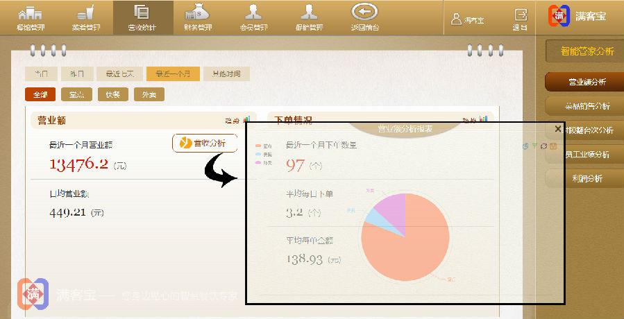 满客宝不仅是简单的收银工具,而是通过互联网以及各种移动终端连接商家与顾客的关键纽带。从为商家提供服务的角度来说,满客宝表面上是为商家提供各种便利的管理和营销手段,实则是帮助商家用互联网思维经营餐厅。早期餐饮O2O的重心是将线上引流到线下,经过一段时期的探索,发现只有专注于线下服务才能更好的留住顾客。因此,满客宝一方面在餐厅的日常经营管理上下足功夫,将基础的点餐支付操作丰富为多样化的点餐(PC、PAD点餐,手机扫码点餐)、多样化的支付方式(现金、刷卡、会员卡、扫码在线支付),更是贴心的提供了携带支付二维码的对账单打印功能,同时预订(微信预订、电话预订、宴会预订)、排队、快餐管理和外卖管理功能一应俱全。另一方面,满客宝还为不同类型的餐厅提供精细化的管理功能,如会员营销、智能管家、财务报表、数据分析和OEM连锁店管理。满客宝会针对不同类型不同需求的餐厅推荐其适用的管理功能,通过详细的数据分析为餐厅推出新菜品、成立新店甚至建立品牌提供强大的决策支持。因此,餐厅经营有方的关键不是拥有一个餐饮管理软件,而是如何好好利用它。