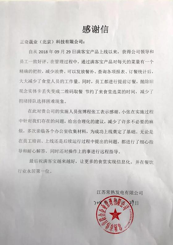 甲方的满意是对我们最大的鼓励,为用户和食堂带来双重价值,一直是我们孜孜以求的目标,在此感谢客户的赞许与信任!