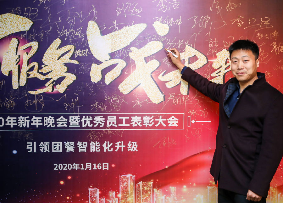 满客宝CEO于义海回顾了公司成长历程,分析了团餐信息化发展进程、特点及市场竞争,明确了公司定位,确定了2020年公司战略,重点解读了“心服务、战未来”的年会主题。