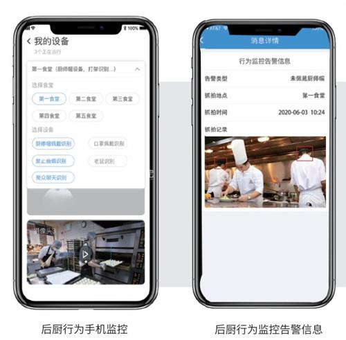 满客宝智慧食堂通过领先的机器视觉、体态识别技术,打造智能AI后厨行为监测功能,系统实时对后厨人员的身份、动作、行为做出判断,发现没有佩戴口罩、手套等异常行为,会自动提醒、警告,并且上报信息到食堂管理人员的移动设备。