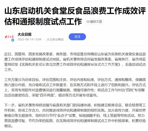 近日,国管局、国家发展改革委、商务部、市场监管总局确定山东省为实施机关食堂反食品浪费工作成效评估和通报制度试点地区。省机关事务局会同省发展改革委、省商务厅、省市场监管局印发《实施机关食堂反食品浪费工作成效评估和通报制度试点工作方案》,全面启动试点工作。