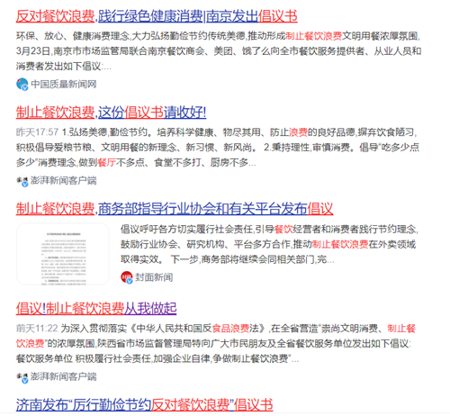 近日,为深入贯彻落实《中华人民共和国反食品浪费法》,营造“崇尚文明消费、制止餐饮浪费”的浓厚氛围,多省市各地发出“制止餐饮浪费行为 培养节约习惯”的倡议书,对广大消费者及餐饮服务单位均提出具体要求,共同树立节约粮食的新风尚。