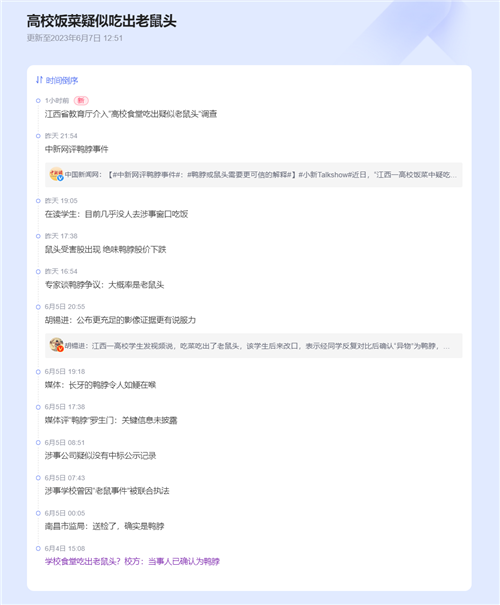 6月1日下午,一则“江西一高校饭菜中疑吃出老鼠头”的视频在网络媒体传播。 后“鸭鼠之谜”引热议,多方回应。其实,不管是鸭是鼠,完整的调查过程和出具权威报告才是公众需要的,高校食堂和监管部门能够负起职责,严格落实卫生管理长效机制,保障学生们的食品安全才是最为凸显的重要问题。