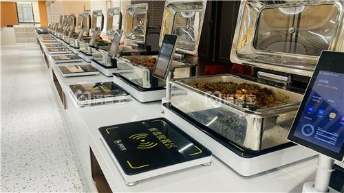 2、托盘放置、按需夹菜:就餐者将餐盘放置在智能秤前的读盘器上,依次拿取想吃的菜肴,设备自动计算每一次取餐重量,智能显示屏精准显示拿取菜肴的重量、价格、营养信息,并对信息进行记录