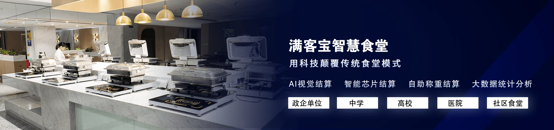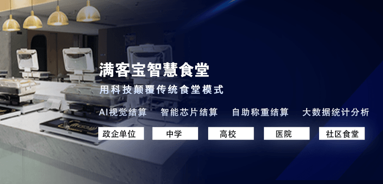 满客宝智慧食堂是基于政府机关、企事业单位、医院、学校等食堂管理模式,创新打造的食堂订餐及就餐模式。系统支持多种食堂就餐形式,包括自选餐、自助餐、档口就餐、预订取餐等,满足食堂多样化餐饮模式的需求。同时系统具备强大的后台管理功能,不仅包括用户管理、消费限制、菜谱管理、卡务管理、进销存管理、数据统计、互动中心、食品安全、食堂环境监测、后厨行为检测、就餐客流量统计等,还有高端的食堂总部管控能力,满足所有规模的食堂管理需求,为食堂管理者提供食堂优化运营的数据支撑。