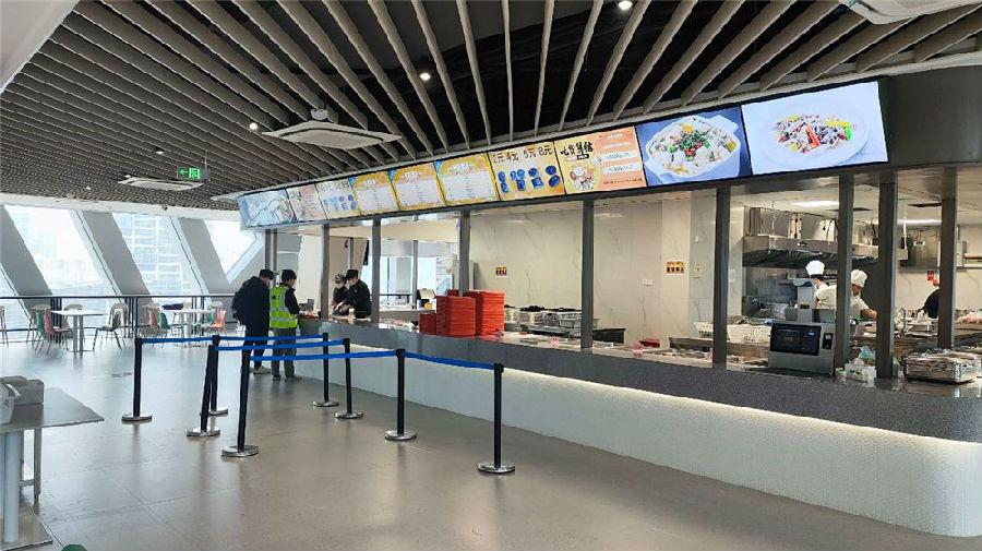3、为满足所有职工选餐需求,满客宝智慧食堂在所有档口选餐上方均放置菜谱展示大屏,显示食堂的菜品、通知、优惠、特色等信息,对应档口自选餐品,让职工对食堂餐品更加了解、清晰,高效就餐。