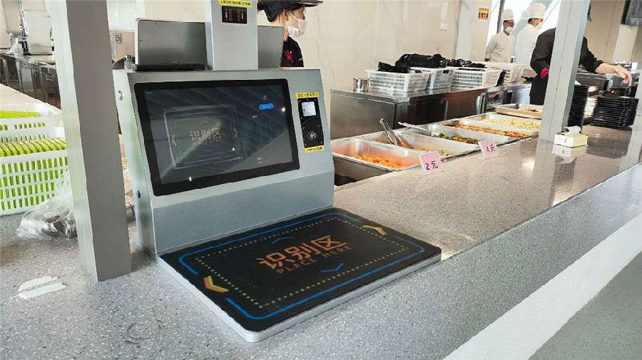 2、根据食堂内布局及空间、费用问题,满客宝智慧食堂应用桌面式AI智能视觉结算终端,当用户自助取餐后,将菜品放置视觉结算收银机识别区,顶部的Ai摄像头将会快速识别菜品并报价,实现快速识别菜品、自动结算、数据分析等功能。