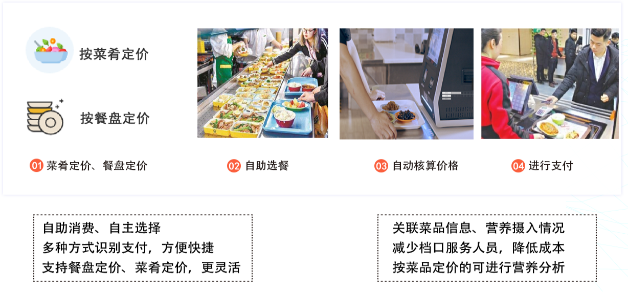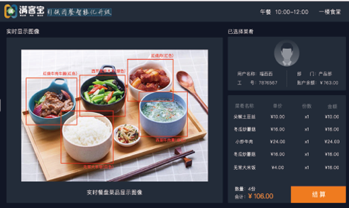基于视觉识别分析技术,通过本地识别服务,实现AI视觉识别餐具和菜品。用餐人员选择自己想要的餐品放在餐盘内,将其放置在视觉结算台,系统根据菜品图像自动识别、核算整单菜价,用餐人员直接通过扫码/刷卡/刷脸的方式完成结算,核算扣费秒完成,节省打餐结算时间,避免排队影响就餐体验,节省运营成本,同时支持本地局域网免费部署。