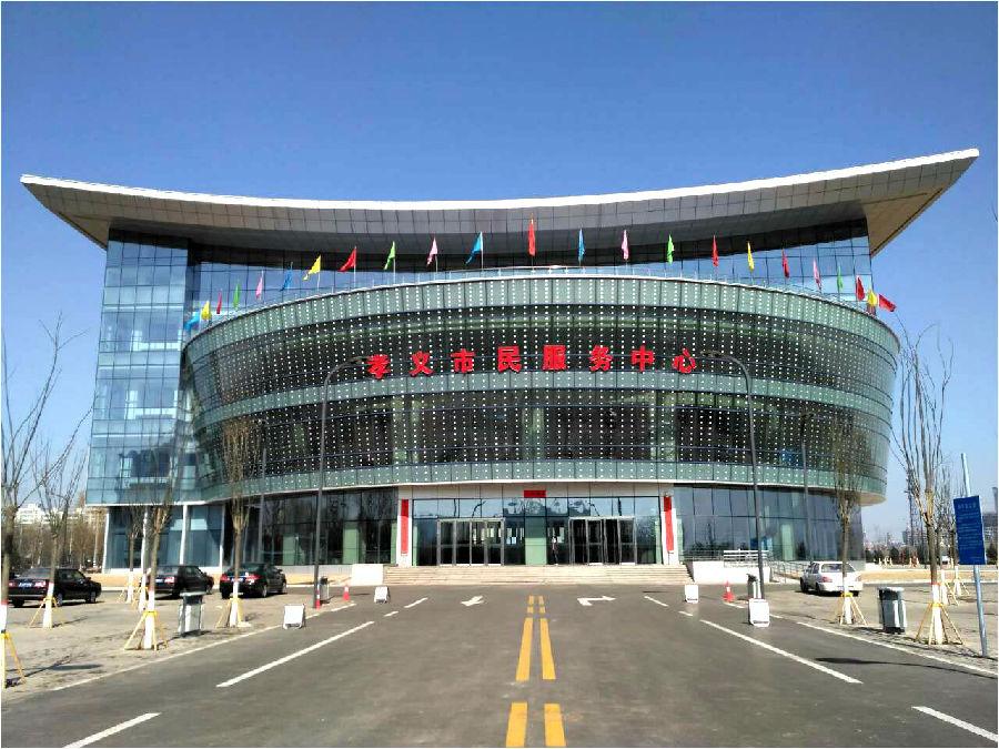 孝义市市民服务中心集行政审批、公共资源交易、工程建设项目招投标、市民热线、政务监察、绩效评价、政务公开等十二大功能于一体。中心主体建筑结构为地上4层、地下1层。目前市民服务中心入驻63家单位。其中:地下1层为行政保障区。地上1层为公共服务区,入驻36家公共服务单位,承办“五险一金”、社会服务、公安事务、金融服务等90项民生事项。地上2层为行政审批区,入驻37家行政审批部门,承办249项审批事项。地上3层为公共资源和农村产权交易区。地上4层为智慧城市管理服务、网络服务及政务管理区。