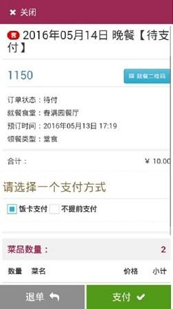 就餐者订餐后,可以直接进行在线支付操作,直接扣费。也可以选择“不提前支付”。订餐后,凭借就餐二维码到食堂售饭窗口进行扫码支付操作。乐订餐在线支付支持微信钱包、支付宝、网银支付等方式。