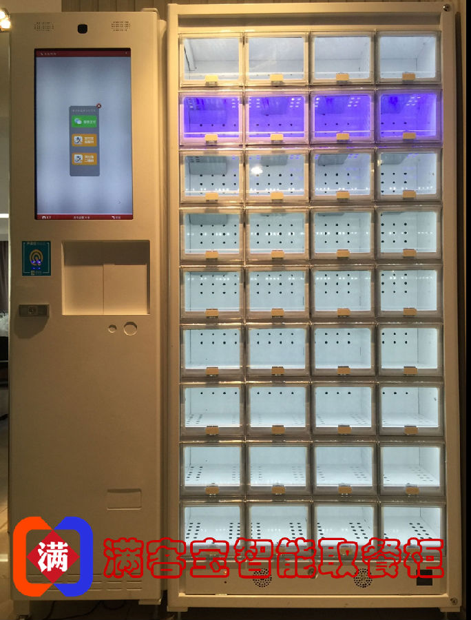 满客宝智能取餐柜搭载满客宝智慧食堂软件系统使用,就餐者使用满客宝智慧食堂的预订功能在手机APP、微信或网页上提前点餐、支付,食堂收到订餐信息后精准备餐并提前将餐品送至智能取餐柜。满客宝智能取餐柜外型颇似超市里常见的自助储物柜,并标配21寸高清触摸屏显示器,便于就餐者自助取餐并可以实现在线支付和不间断视频宣传片播放,每台柜子分为36个小餐柜,具有保温/保鲜功能,能实现0-60度的智能温度控制。在保证食材不变质的安全温度范围内既能保障饭食的温度,又能保持其鲜味。独立的小餐柜将每位用餐者的饭菜分开存放,既安全又卫生。满客宝智能取餐柜通过有线网络、无线WIFI、手机3G/4G与满客宝智慧食堂后台系统相连,因此可以将智能取餐柜遍布于各个固定区域(写字楼大厅、学生宿舍、旅游景区、工厂车间、医院大厅、车站等),用餐者可随时扫码刷卡取餐,不用在就餐高峰去食堂排队拥挤就能吃到热腾腾的饭菜,这对就餐者来说将是遍地都是食堂。另外,满客宝智能取餐柜融入物联网技术,可实现分布式餐柜的实时温度、取餐状态、视频等信息的远程监控。从而轻松做到及时给未按时取餐用户的短信或微信友情提示。