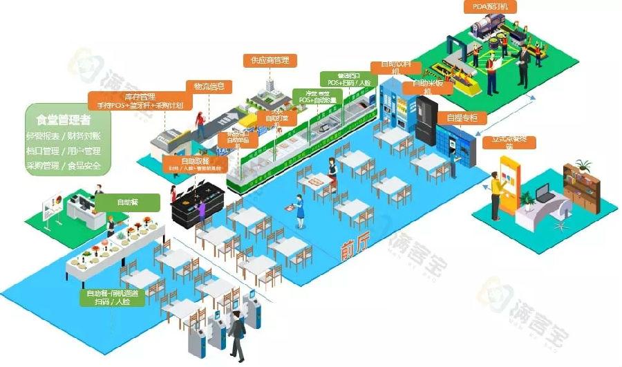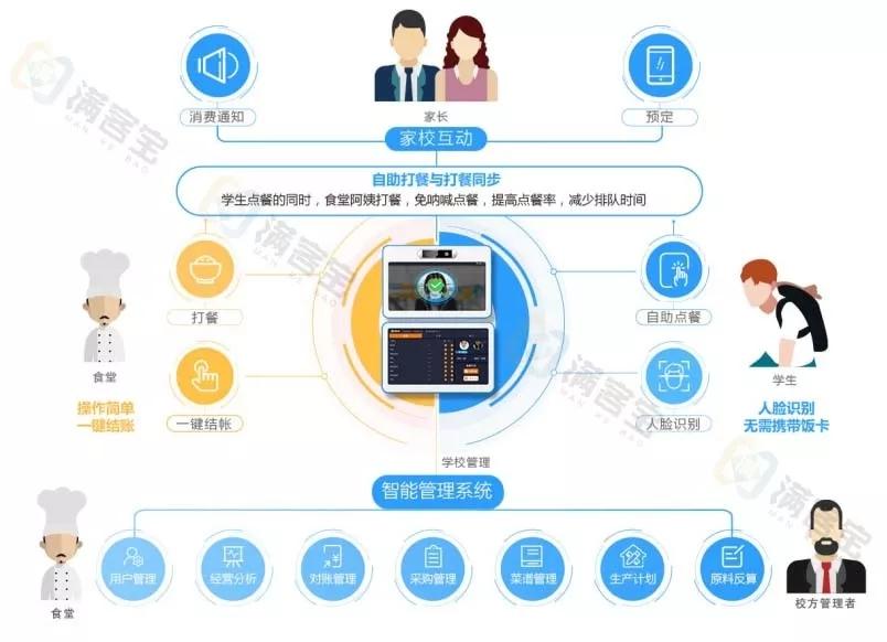 食堂:免计算,一键快速结帐;免呐喊,安静高效配餐;获取数据,精准备餐。