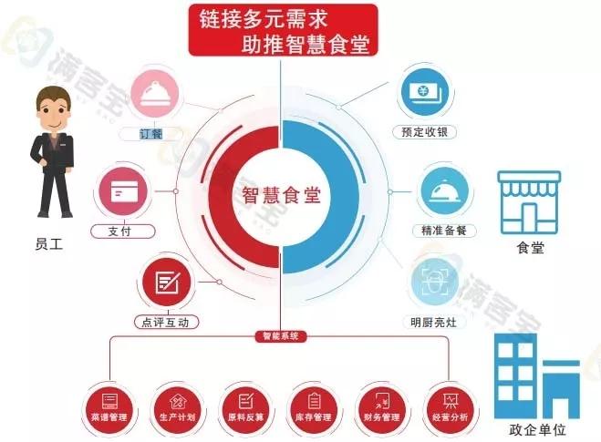 在大数据和云计算的背景下,各行各业已经步入信息化时代,满客宝以团餐ERP系统为核心产品,同时具备各类智能软硬件系统集成,及线上线下运营能力,实现对企事业、医院、学校等不同业态食堂的采购、生产、售卖、经营分析等全流程服务管理。