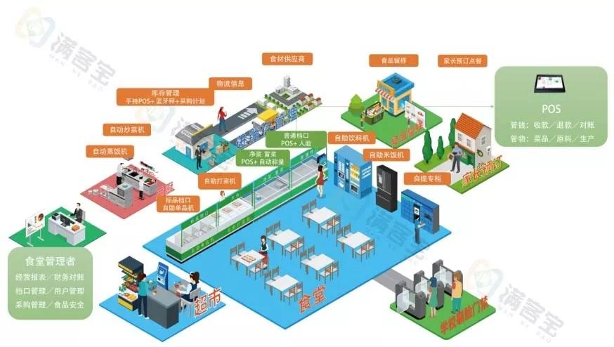 学校:数据统计-财务对账;食堂/档口分析&管理;菜品分析&管理;供应链管理。