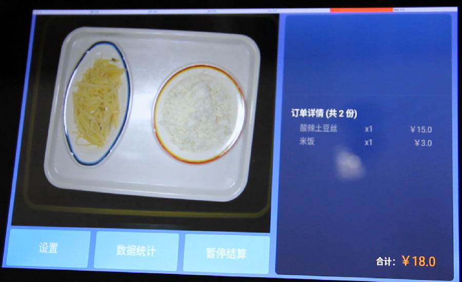 视觉识别结算台,利用图像识别技术,实现自助快速结算。只需将餐盘放于结算台上,通过AI视觉识别技术识别餐盘或菜肴,系统将自动完成价格计算,并将消费金额传输到支付终端。