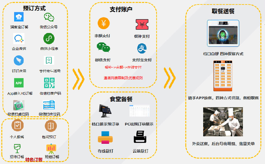 满客宝智慧食堂订餐系统的15种订餐方式配合堂食、外卖、餐柜自提、净菜自提等方式实现就餐。满客宝智慧食堂订餐系统实现了用餐人员便捷订餐、取餐,人员零接触。食堂管理中达到精准备餐,降低成本。后勤管理上实现员工互动,提升服务质量,提高员工满意度。