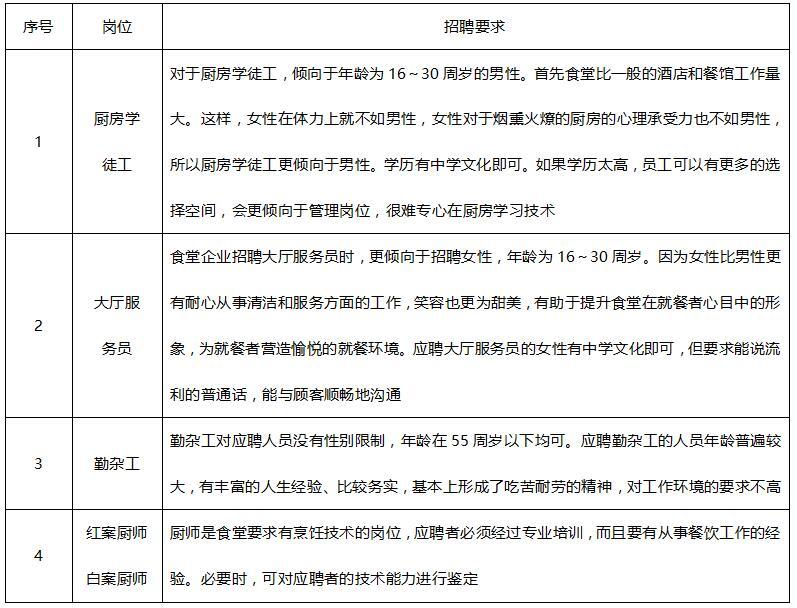 食堂企业的招聘对象有它的特殊性,基层生产和服务岗位一般要求应聘者无残疾,无夜游症、色盲、精神病,无肺结核、肝炎等传染病,品行方面要求能够吃苦耐劳,没有违纪、违法等不良记录。