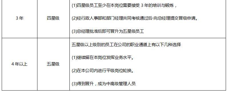 中级经理在管理岗位2年级以上经验,并且在连续两次绩效考核成绩为良级以上,经行政人事部推荐,董事会审批方可成为高级经理。