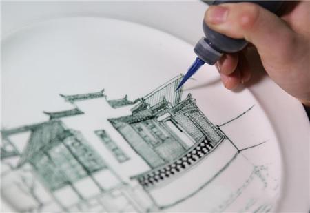 昨天下午,海宁小伙陈宇展示他画在盘子上的海宁故事。