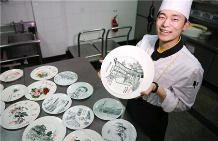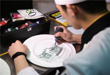 陈宇今年24岁,在海宁一家酒店担任冷盘厨师,为了让食客能边就餐边了解海宁风土人情,他从2015年10月开始,用食用果酱在盘子上作画。