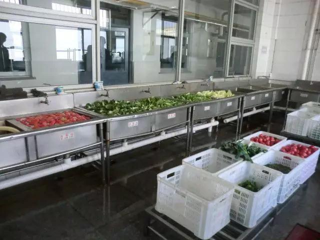 肉类和蔬菜分类洗涤,做到“一刮二洗三冲洗”。每天所用的蔬菜要先浸泡半个小时,然后流水冲洗三遍。初加工间一共有8名工作人员,其中有2名专职人员会对初加工进行全程监督把关,保证加工安全干净卫生,冷冻食品也要完全解冻后才能进入加工程序。