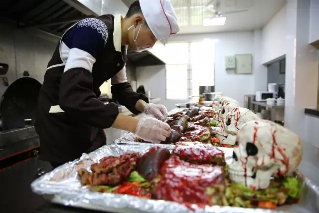 “人体”大餐、“人眼”泡汤、麻辣“人脑”……听起来是不是惊悚又刺激,真的可以吃哦~,在这些“血淋淋”的食物面前,学生们真是尖叫不断,甚至还有临阵脱逃的。师傅,你认真做菜的样子,好可怕啊。