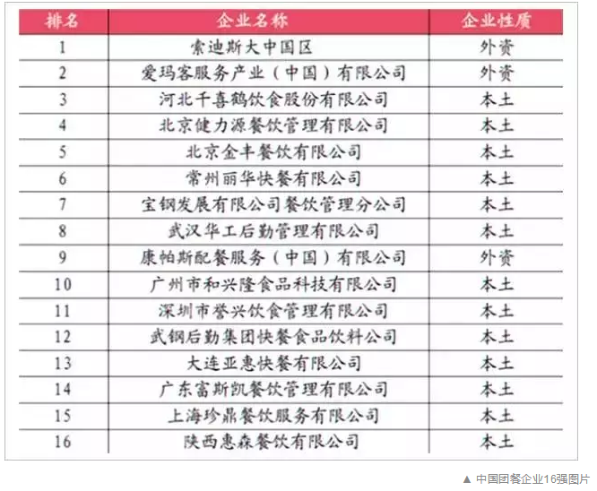 上图的本土团餐巨头,有承担3/4军事院校餐饮的千喜鹤集团、为200多家单位提供团餐外包服务的健力源集团、以经营中央国家机关团餐为主业的金丰餐饮集团。