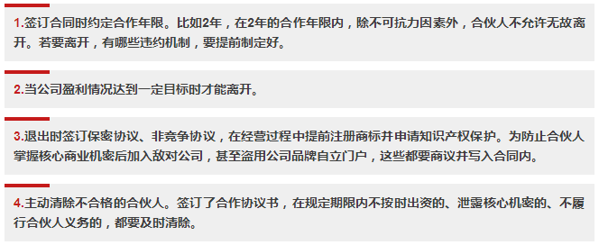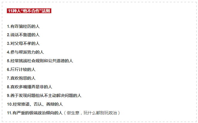 3.良好的人品。找合伙人要首先进行“政审”,有诈骗经历的、爱吹牛又极度好面子的、小肚鸡肠的、爱推卸责任的……凡此种种,均不能与之合伙。有创业者甚至总结出十几种情况下的“绝不合作”法则,可见良好的人品在寻找合伙人中有多重要。