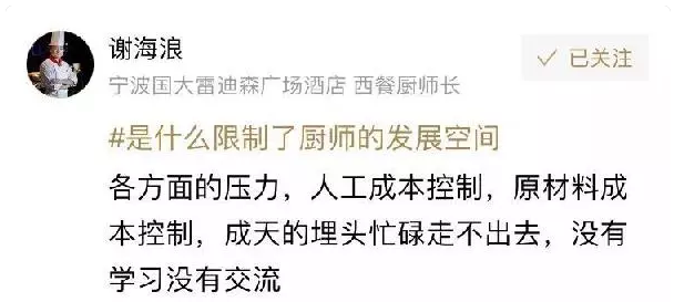 超过八百名厨师在“是什么限制了厨师的发展空间”的讨论中,非常真诚且真实的分享了自己的想法。这里一定也有你想听到的共鸣之声。