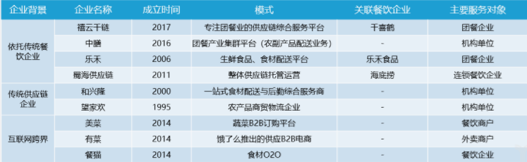 以供应链整合为目的的企业在近几年才开始出现,大多具有互联网背景,依托信息共享能力快速调整模式,整合供应链资源。但此类型企业缺点在于对大型供应商资源的把控能力、谈判能力较弱,特别是团餐业中服务对象以大规模采购为主,服务门槛相对较高。