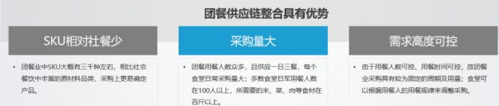 对比社餐业,团餐业中采购SKU相对较少,且采购量大,企业在与厂家的合作中具有一定议价权。加之需求高度可控,不得否认,依托于多年运营经验的团餐企业,在供应链整合中的难度也会降低。