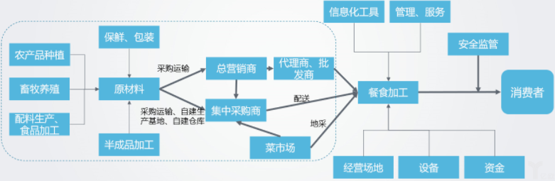 供应链在餐饮业产业链上集中度较低,大多都是大型餐饮企业依托渠道,通过多年的运营经验构建起完整的供应商资源、物流、仓储体系,继而探索出为领域内其他企业赋能的模式,以解决产能过剩问题。如禧云千链团队有在千喜鹤集团多年的供应链运营经验,在2017年将该板块服务剥离出,赋能于其他团餐运营企业。