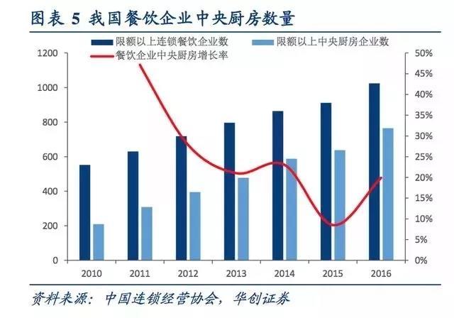据中国连锁经营协会数据,2016年我国限额以上连锁餐饮企业数912家,中央厨房普及率达到70%,即拥有央厨的限额以上餐饮连锁品牌为765家。