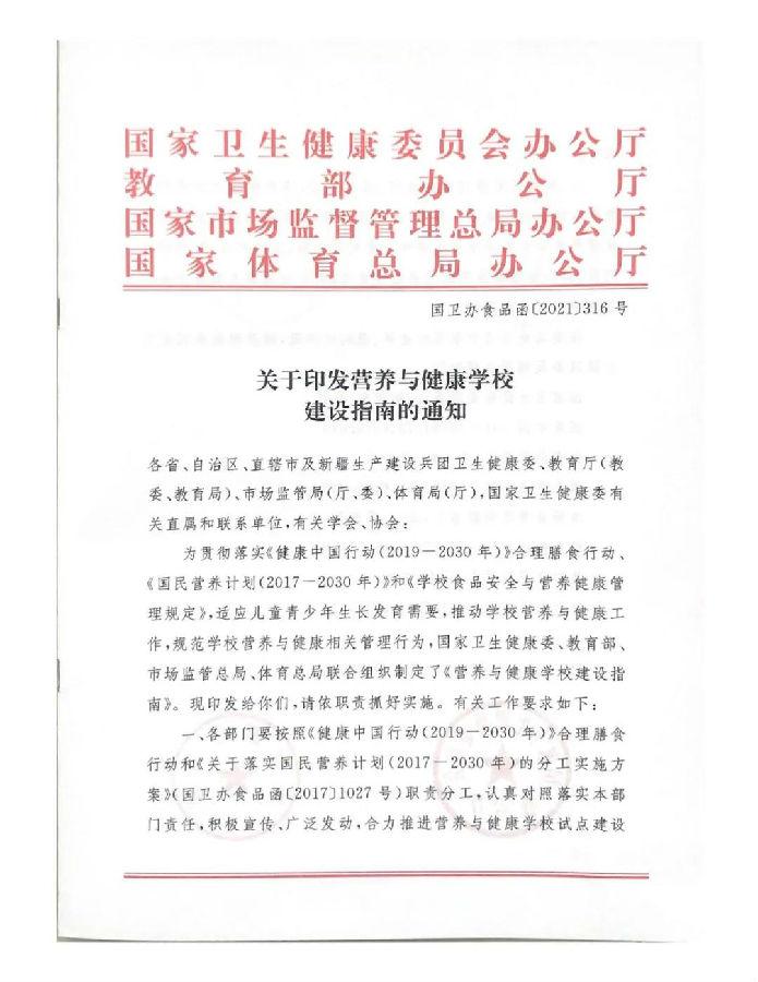 近日,国家卫生健康委办公厅、教育部办公厅、市场监管总局办公厅、体育总局办公厅联合发布《关于印发营养与健康学校建设指南的通知》(以下简称《通知》)。《通知》指出,各部门要按照《健康中国行动(2019—2030年)》合理膳食行动和《关于落实国民营养计划(2017—2030年)的分工实施方案》(国卫办食品函﹝2017﹞1027号)职责分工,认真对照落实本部门责任,积极宣传、广泛发动,合力推进营养与健康学校试点建设工作。