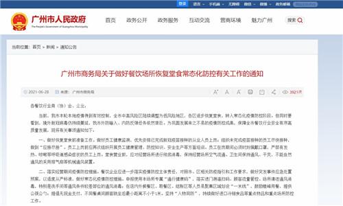 6月28日,广州市商务局发布《关于做好餐饮场所恢复堂食常态化防控有关工作的通知》,要求餐饮企业应进一步落实疫情防控主体责任,对照市、区相关防疫指引和工作要求,做好突发事件应急处置预案,以适度从严标准,做好常态化疫情防控措施。