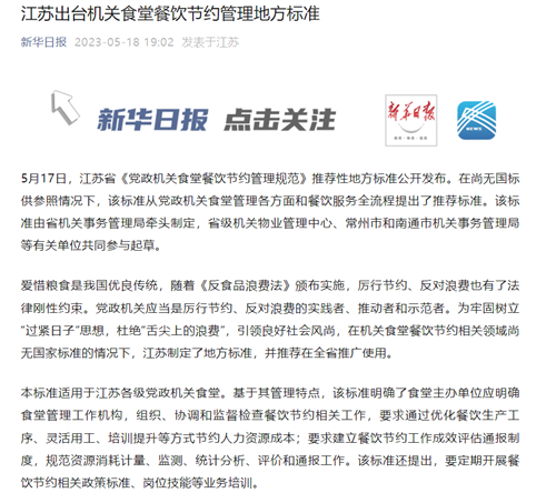 近日,江苏省《党政机关食堂餐饮节约管理规范》(以下简称“管理规范”)推荐性地方标准公开发布。在尚无国标供参照情况下,该标准从党政机关食堂管理各方面和餐饮服务全流程提出了推荐标准,并进行发布实施,这也就意味着机关食堂建设智能节约迫在眉睫。