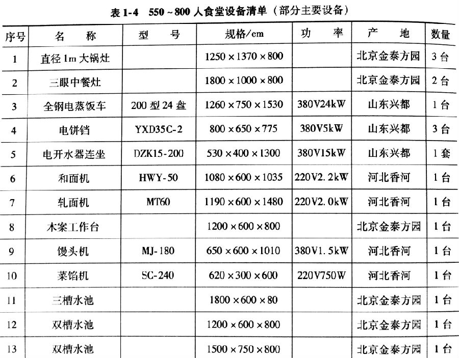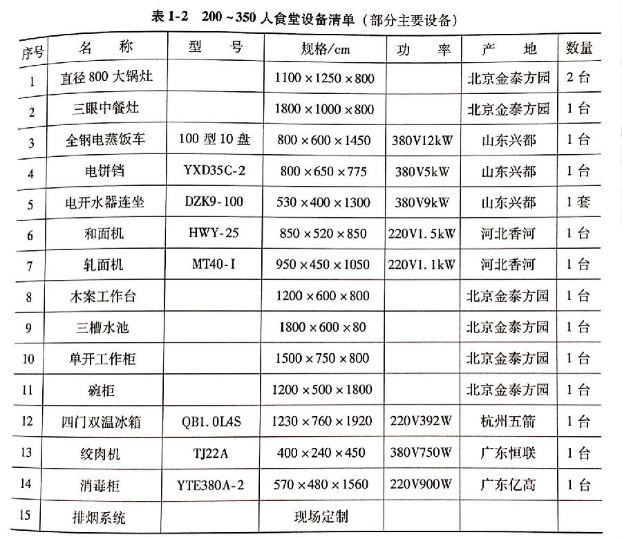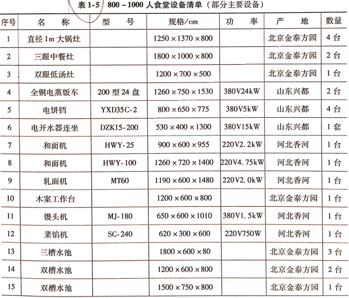 食堂设备购置首先应该考虑就餐人数及场地和食品处理区场地面积等。必要的炊事机械和厨房设备是搞好食堂伙食的必备条件之一。通过炊事机械和厨房设备的加工制作,能够更好的提现食品的营养、价值和感官。食堂对炊事机械和厨房设备的有效利用,还能降低食堂炊事人员的劳动强度,提高工作效率,保证伙食质量。因此,配置必要的炊事机械和厨房设备是食堂开办的重要组成部分。当然,也要根据实际需要、按照客观需求,不可盲目钩子,避免不必要的浪费和损失。表1-1~表1-5提供了不同规模食堂的设备清单。