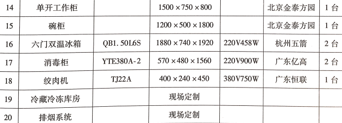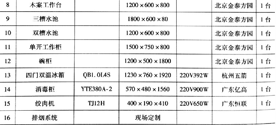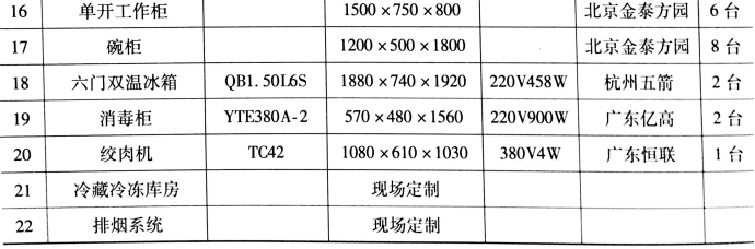 注:带冷荤凉菜的吓你过目的需要按冷荤间规定达到专人、专室、专工具、专消毒、专冷藏等配置。具体应为冰箱一台,专用洗手池一个,清洗、消毒、冲洗水池各一个,专用工作台等。同时,应具备二次更衣条件。其他餐、厨用具用户可根据需要自行配置。