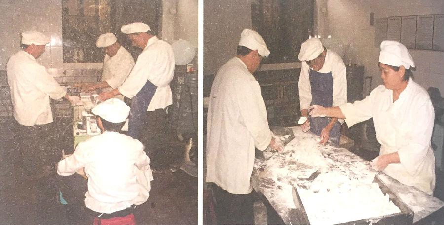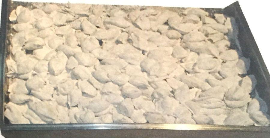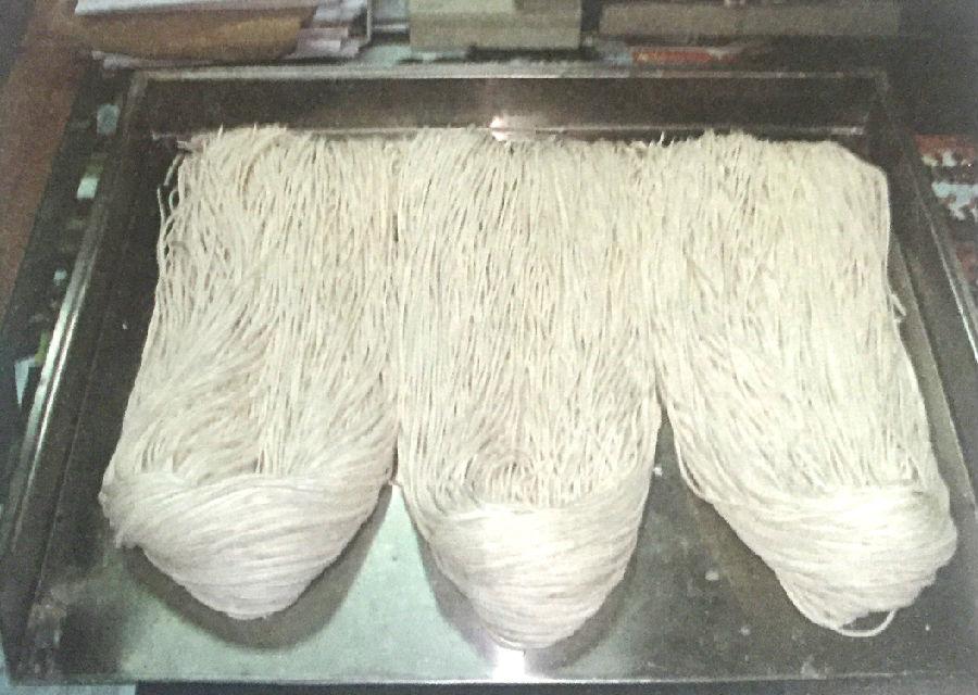 取富强粉按1;0.3比例将面和匀,上压面机压均匀面光滑细腻时掺淀粉薄面,压面机装机刀将面压出。