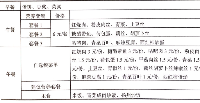 表2-6是某中学的一天菜单。可以看出菜单的设计充分考虑了中学生的营养需求,荤素搭配合理、营养全面丰富:主食以米饭为主,符合当地饮食习惯;套餐价格也和当地的消费水平吻合。