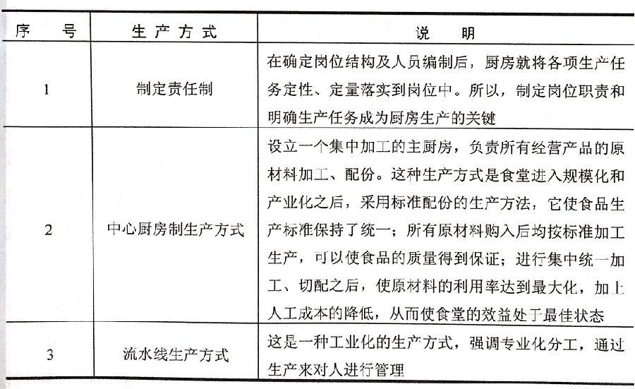 合理的厨房生产方式,可以为食堂带来巨大的经济效益。常见的厨房生产方式见表
