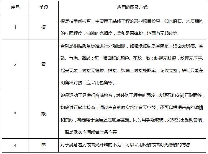 试验检查法是通过试验手段,对质量进行判断的检查方法。装修工程中,比较常见的试验检查有:对钢结构进行稳定性检验,确定是否产生失稳现象;对钢筋的焊接头进行拉力试验,检验焊接质量;对吊顶的吊杆进行抗拔试验,检验其承载力;对防水的地面进行存水试验,检验其防水效果;对给水管路进行压力试验,检验有无渗漏现象。