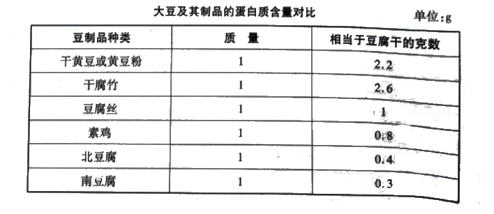 (2)大豆及其制品。《中华人民共和国卫生行业标准—学生营养午餐营养供给量》标准中所规定豆制品的数量是以豆腐干为1,其他豆制品则可依其蛋白质含量进行折合,其比例见下表。