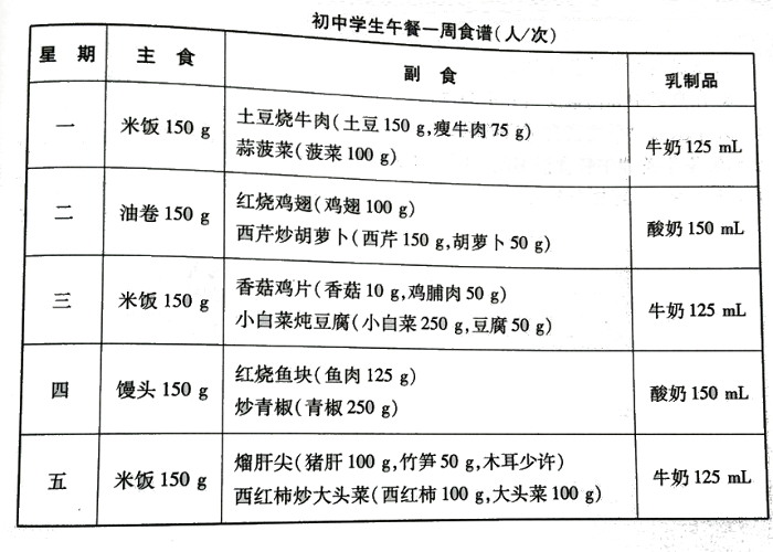 1998年,我过颁布了《中华人民共和国卫生行业标准—学生营养午餐营养供给量》的行业标准。此标准中规定:学生营养午餐就是在上学日,由学校食堂或饮食供应中心等为在校学生提供的符合营养要求的午餐。以一周五天为单位的日平均食物摄入量,午餐各类营养素的摄入量应占《推荐的每日膳食营养素供给量标准》的40%。