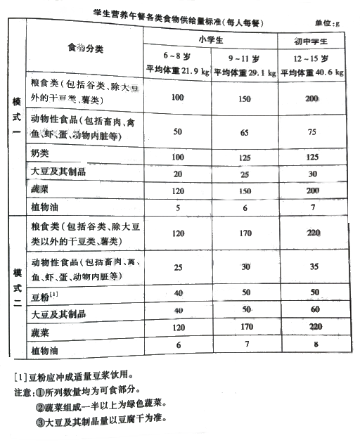 2、学生营养午餐各类食物的供给量标准