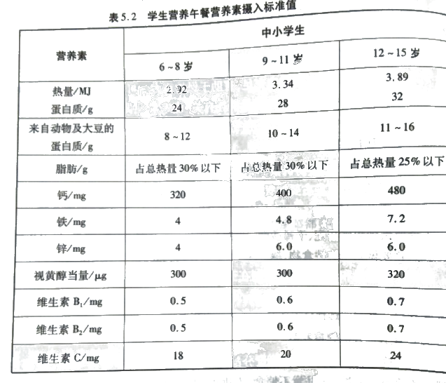 1、学生营养午餐营养素摄入标准值