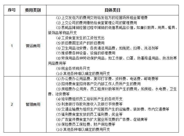 期间费用包括两大类:营运费用和管理费用,营运费用是食堂经营部门在经营过程中发生的各项费用;管理费用是食堂的生产服务部门为组织和管理生产经营活动而发生的各项费用,如下表。
