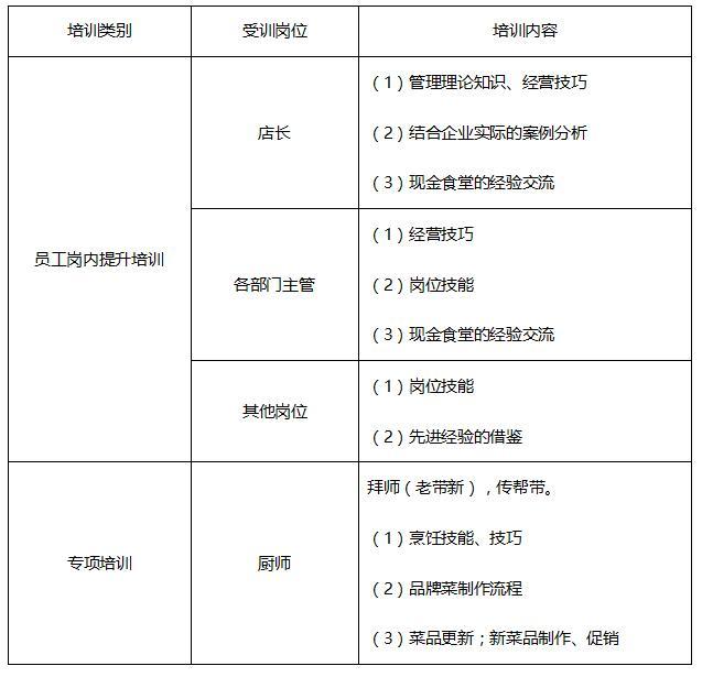 对集团化经营的食堂企业来说,培训可以分为员工入职培训、员工上岗资格培训、员工岗内提升培训、储备干部培训、食堂开业培训和食堂运营培训,在培训内容和培训方式方面各有不同。